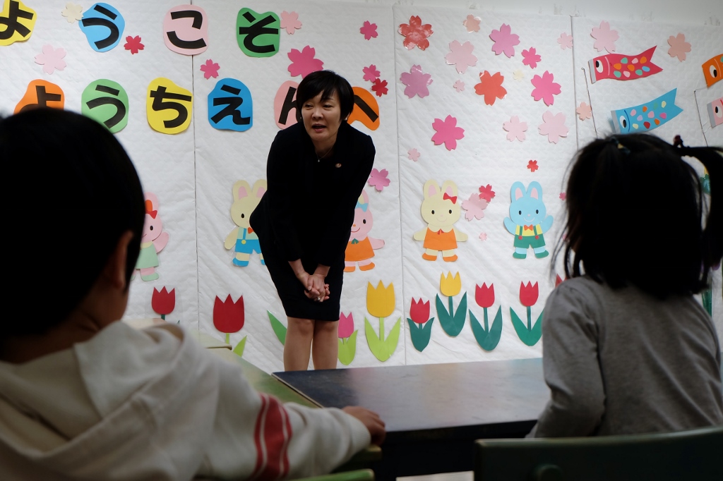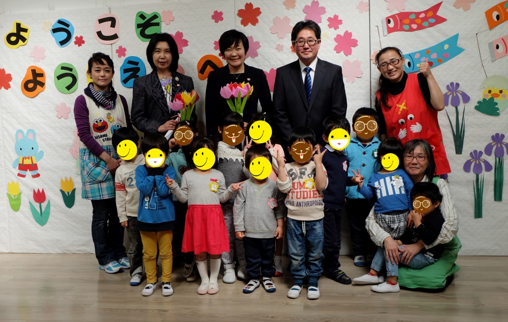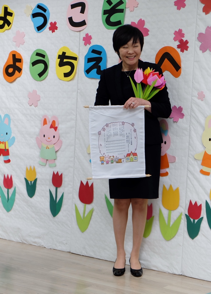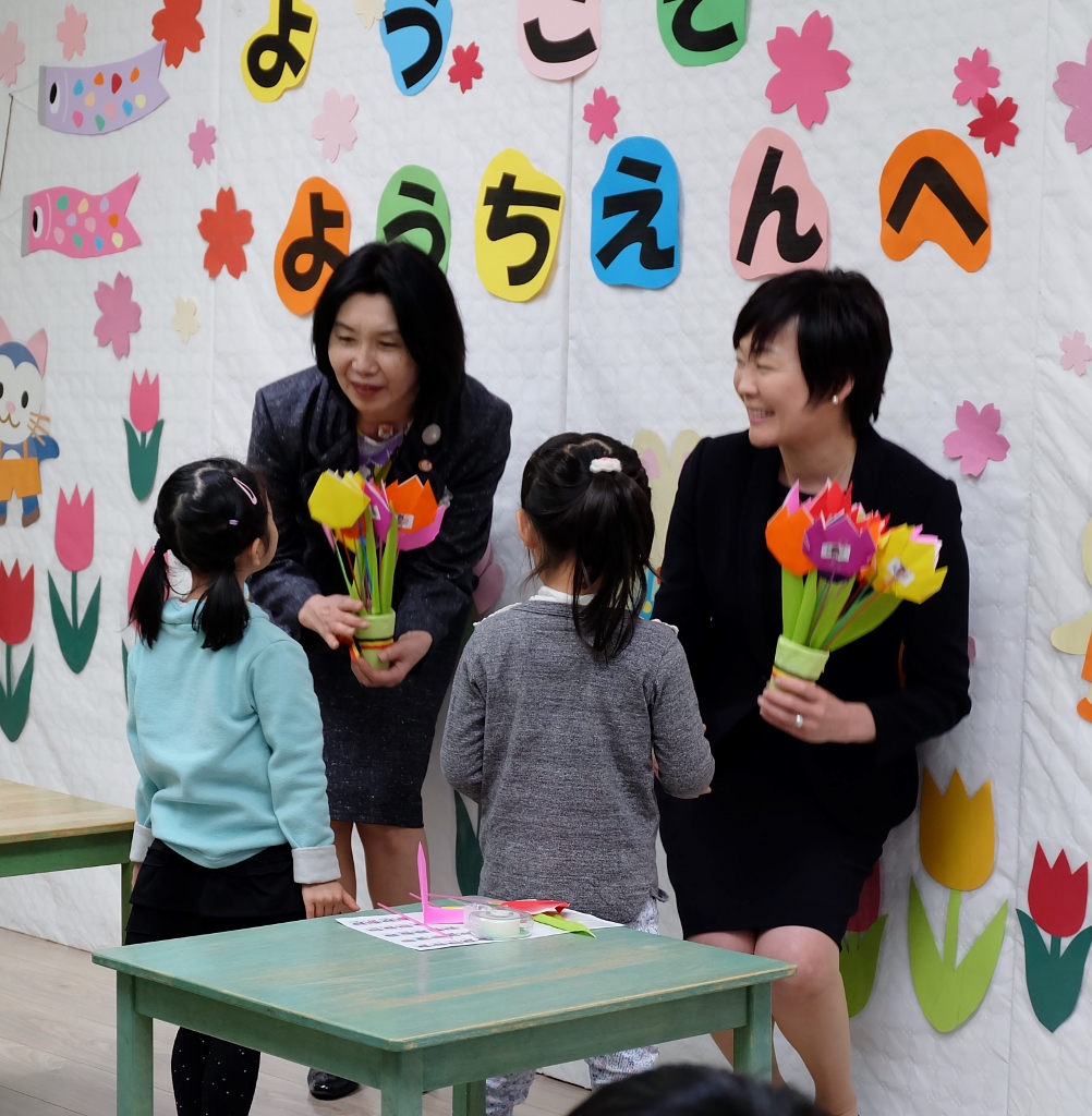 | 5月3日 それまでの寒空が嘘のような快晴の下、 石井大使夫人と共にお車にてご到着されました。 保護者のお出迎えの中、幼稚園にお入りになり ました。 早速、園児たちによる「幼稚園の歌(園歌)」を 披露しました。 続いて工作の時間。みんなで色紙を使って春色の チューリップを折りました。 ストローの茎、クレープ紙の葉っぱをつけ自分の ネーム写真を貼り、ポットにいれて、鉢植えの チューリップの出来上がりです。 そして「大阪うまいもんの唄」 「ベルギーうまいもんの唄」を披露。 園児のコミカルで愛らしい姿を微笑みながら 鑑賞されました。 幼稚園から記念品を贈呈。また総理夫人から |